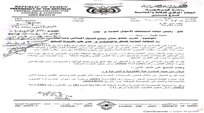 أظهر تقرير ملحق صادر عن فرع الجهاز المركزي للرقابة والمحاسبة في عدن بتاريخ 13 أبريل 2026م ، والمرفوع إلى رئيس نيابة استئناف الأموال العامة، نتائج مغاي...