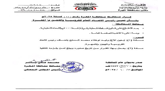 أصدر محافظ محافظة المهرة، رئيس المجلس المحلي، الأستاذ محمد علي ياسر، اليوم، القرار الإداري رقم (21) لسنة 2025م، بشأن تعيين الأخ وليد نوخذا محمد السنح بلحاف رئيسًا للاتحاد العام للفروسية والهجن والمزاينة والمحالبة بمحافظة المهرة.