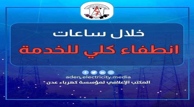 تعلن المؤسسة العامة للكهرباء – منطقة عدن عن قرب توقف منظومة التوليد بشكل كامل خلال الساعات القادمة، نتيجة استمرار احتجاز ناقلات النفط الخام القادمة من الضبة في منطقة أحور بمحافظة أبين ومنعها من الوصول إلى محطة الرئيس.