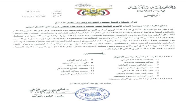 أصدرت هيئة رئاسة مجلس النواب، عصر يوم الخميس الموافق 30 أكتوبر 2025م في اللقاء التشاوري لمجلس النواب المنعقد عبر الاتصال المرئي قراراً بشأن تكليف لجنة برلمانية لإعداد الاَليات الخاصة لعقد لقاءات واجتماعات المجلس عبر وسائل الاتصال المرئي.