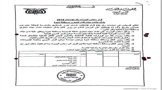 أكدت السلطة المحلية بمحافظة شبوة أن ميناء قنا التجاري ليس من المنافذ البحرية المستحدثة أو المخالفة، مشيرةً إلى أن تأسيسه جاء بموجب قرار مجلس الوزراء رقم (4) لعام 2018م الصادر بتاريخ 11 يناير 2018م، الذي وافق على إنشاء الميناء بمنطقة المجدحة وجعل تبعيته لمؤسسة موانئ البحر العربي اليمنية، مع تكليف الجهات المعنية باستكمال الإجراءات التنفيذية والتمويلية اللازمة.