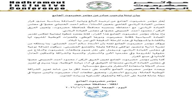 كما يثمّن مؤتمر حضرموت الجامع تعيين الفريق الركن / محمود أحمد الصبيحي عضوًا في مجلس القيادة الرئاسي متمنيًا له التوفيق في أداء مهامه الوطنية، وبما يسهم في تعزيز مسار الدولة واستعادة الاستقرار وترسيخ مؤسساتها.
