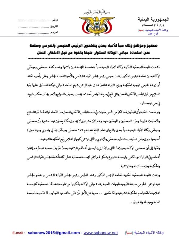 ناشدت اللجنة الصحفية النقابية بوكالة الانباء اليمنية سبأ بالعاصمة المؤقتة عدن بإسمها وباسم كافة صحفيي وموظفي الوكالة بعدن فخامة الرئيس الدكتور رشاد العليمي رئيس مجلس القيادة الرئاسي والأخوة اعضاء المجلس وعلى رأسهم القائد أبو زرعة المحرمي توجية الحكومة ووزير الدولة محافظ عدن عبدالرحمن شيخ إستعادة مباني الوكالة المستولى عليها بقوة السلاح من قبل المجلس الإنتقالي المنحل والتي تقع في مدينة التواهي أحدهما بجانب رصيف السواح والاخر بجانب مكتب البريد في حي البنجسار.