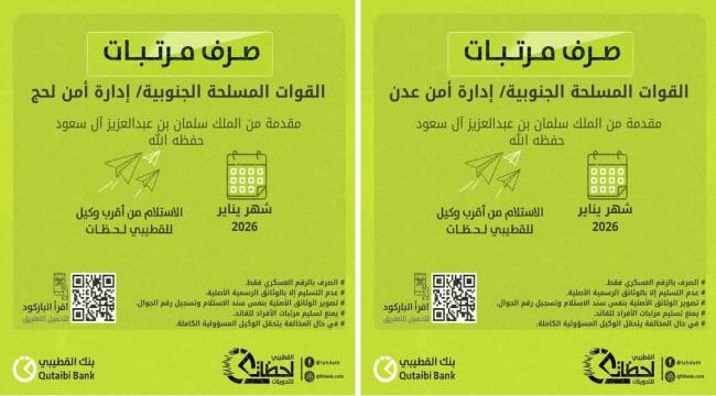 بدأ صرف مرتبات منتسبي إدارة أمن محافظتي عدن ولحج لشهر يناير 2026م، بدعم كريم ومباشر من خادم الحرمين الشريفين الملك سلمان بن عبدالعزيز آل سعود – حفظه الله – في إطار حرص المملكة العربية السعودية على دعم القوات المسلحة الجنوبية والأجهزة الأمنية، وتعزيز الاستقرار المعيشي، والمساهمة في ترسيخ الأمن والاستقرار في المحافظات المحررة، بما يعكس مواقف المملكة الثابتة تجاه اليمن وشعبه.