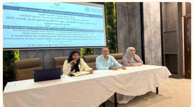 وأوضح، أن نتائج هذه الورشة ستسهم في تحسين جودة التقرير السنوي للدول الأطراف وتعزيز مصداقيته بما يعكس صورة دقيقة عن الوضع الصحي في اليمن ويدعم جهود الحشد والتنسيق مع الشركاء الدوليين وعلى رأسهم صندوق الجائحات لتوجيه الموارد نحو المجالات ذات الأولوية القصوى.