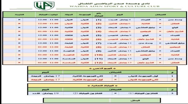 يُدشّن نادي وحدة عدن مساء اليوم السبت، الرابع من شهر رمضان المبارك، انطلاق البطولة الرمضانية لجميع الفئات العمرية، وذلك في أجواء رياضية مميزة تعكس تاريخ النادي العريق وحضوره في الساحة الرياضية العدنية.