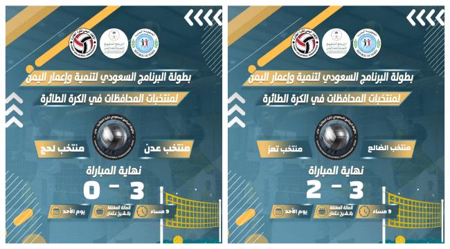 فاز منتخبا محافظتي عدن والضالع على نظيرهما لحج وتعز، في منافسات اليوم الأول من بطولة البرنامج السعودي لتنمية وإعمار اليمن لمنتخبات المحافظات للكرة الطائرة التي ينظمها الاتحاد العام للعبة في الصالة الرياضية المغلقة بالعاصمة المؤقتة عدن، بدعم من البرنامج السعودي في إطار البرنامج الرياضي، الذي يقدمه البرنامج، ويشمل عدة بطولات على مستوى المحافظات اليمنية.
