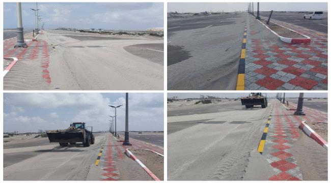 نفذ صندوق النظافة والتحسين بعدن. صباح اليوم حملة لإزاحة الكثبان الرملية من خط ساحل أبين ابتداء من جولة الرحاب وحتى جولة المجاري ( محطات المعالجة ) بمنطقة غازي علوان.