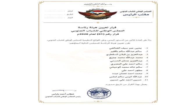 أصدر رئيس المجلس الوطني للشباب الجنوبي الاستاذ / خطاب احمد باراس اليوم قراراً يقضي بتعيين أعضاء هيئة الرئاسة، في خطوة تمثل الركيزة الأولى لاستكمال البناء القيادي للمجلس، على أن يتم غداً استكمال الدورة التنظيمية بإصدار قرارات تعيين الأمين العام ونواب الرئيس، بالإضافة إلى رؤساء المجلس في كافة المحافظات الجنوبية ورئيسً لشؤون الخارجية.