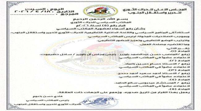 أصدر رئيس المكتب السياسي للحراك الثوري لتحرير واستقلال الجنوب، فادي حسن باعوم، قرارًا رقم (5) لسنة 2026م، بشأن رفع عدد من الأسماء لاعتمادهم أعضاء في ا...