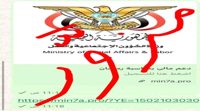 تحذر وزارة الشؤون الاجتماعية والعمل بالعاصمة عدن تحذيراً هاماً لكافة المواطنين بشأن تداول رابط إلكتروني مشبوه عبر بعض مواقع التواصل الاجتماعي، يزعم تق...