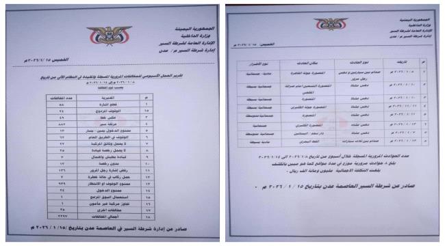 أصدرت إدارة شرطة السير بالعاصمة عدن تقريرها الأسبوعي للفترة من 8 إلى 14 يناير 2026م، موضحة تسجيل 8 حوادث مرورية تنوعت بين صدمات مركبات ودهس مشاة في عد...