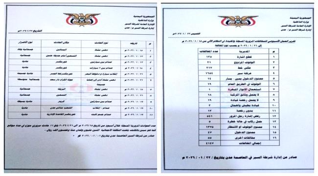 أصدرت إدارة شرطة السير بالعاصمة عدن تقريرها الأسبوعي للفترة من 15 إلى 21 يناير 2026م، موضحة تسجيل 11 حادثًا مروريًا تنوعت بين صدامات مركبات وحوادث دهس...